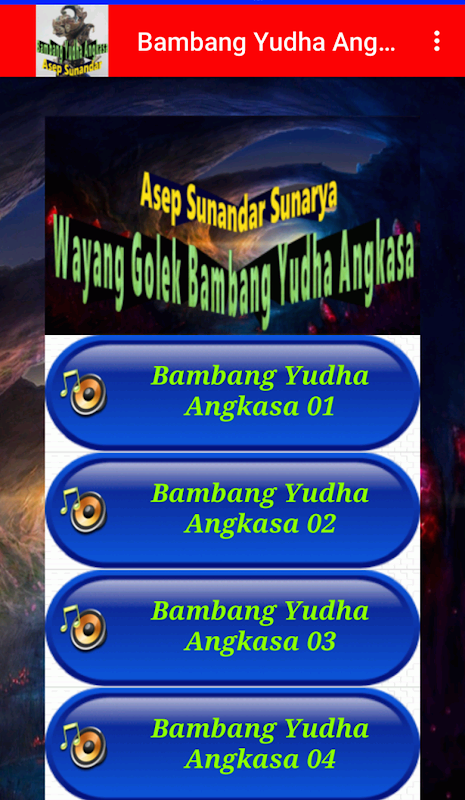 Наслаждайтесь коллекцией сунданского ваянг-голека в пьесе под названием «Бамбанг Юдха Ангкаса» в исполнении Ки Даланг Асепа Сунандара Сунарии. Кукольный спектакль Бамбанг Юдха Ангкаса начался, когда двух сыновей царя Мацуапати послали принести одежду, еду и лекарства Пандавам, которые отбывали наказание в лесу Камиака из-за проигрыша Кураве кубиков. Удалось ли им встретиться с Пандавами? Остались ли Кауравы на месте? Кто те марионеточные фигурки, которые участвовали с двумя принцами? Что было такого ажиотажа в процессе доставки? Пожалуйста, установите и найдите ответ.