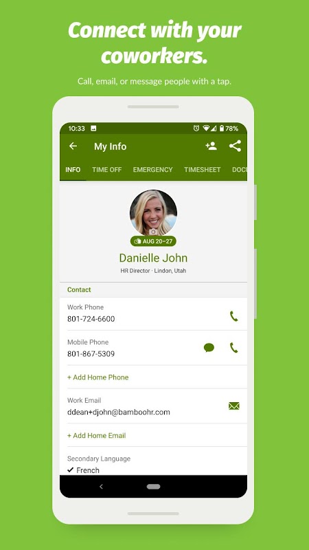 BambooHR - это онлайн-программное обеспечение номер один для управления персоналом для малого и среднего бизнеса, которое переросло электронные таблицы. Мы автоматизируем многие из самых утомительных HR-функций и даем вам возможность выполнять значимую работу. Приложение BambooHR позволяет брать с собой некоторые из этих наиболее важных функций и упрощает и ускоряет выполнение самых распространенных задач в BambooHR.