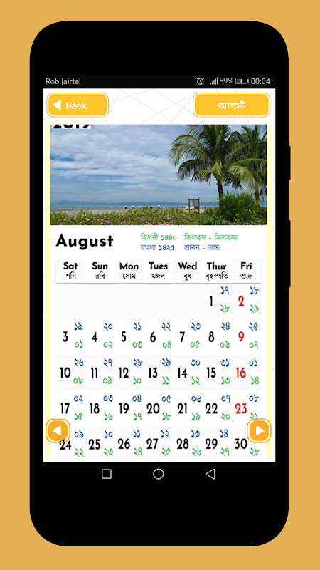 বাংলা ক্যালেন্ডার ২০১৯ অ্যাপটি তৈরি করা হয়েছে পহেলা বৈশাখ ২০১৯ উপলক্ষে ইংরেজি ক্যালেন্ডার ২০১৯ ও আরবি ক্যালেন্ডার ২০১৯ সহকারে। অর্থাৎ একের ভিতর তিন। আপনি বাংলা ক্যালেন্ডার ২০১৯ ডাউনলোড করার সাথে সাথেই ইংরেজি ক্যালেন্ডার ও আরবি ক্যালেন্ডারের তারিখও জানতে পারবেন।