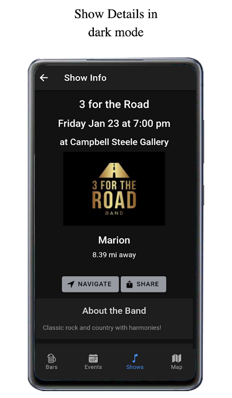Ваше местоположение обязательно. Приложение будет искать только бары, шоу и мероприятия в радиусе 25 миль от вас. Мы не хотим показывать вам шоу/мероприятия на другом конце страны, если это возможно! :)