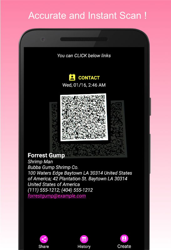 URLs, Text to clipboard, WiFi, Call, SMS, Email, Calendar event, Contact, product detail, ISBN Book, Map, even driver license, coupon and coupon codes. Also, you can share data with other favorite apps.