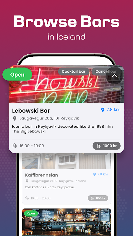 Хватит гадать, начните исследовать. Загрузите Barhopp сегодня и откройте для себя лучшее из ночной жизни Рейкьявика!