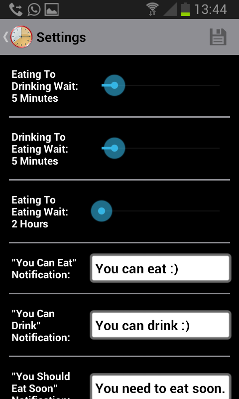 In addition, when the time's up, a second timer for the next meal will start, for which two notifications will later be shot. One is to remind you that you should eat soon (so you can drink) and the other when the time's up to remind you that you should eat.