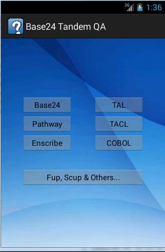 Base24 Tandem QA app contains collection of Questions & Answers in Base24, Pathway, TAL, TACL, COBOL, Enscribe, FUP, SCUP, Spooler, EMS, DDL & SCOBOL, gathered from numerous sources including real interviews.