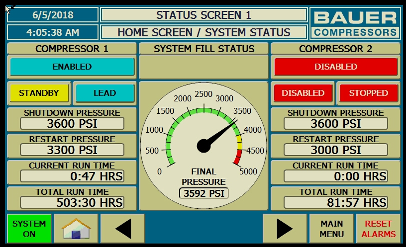 The Bauer Mobile Dashboard™ function within the app provides a simple visual dashboard-type overview of the compressor system which allows the user to monitor all critical functions and values of their Bauer Compressor system in real-time. The Bauer Mobile Dashboard™ also displays real-time system status as well as all current system alerts and faults.