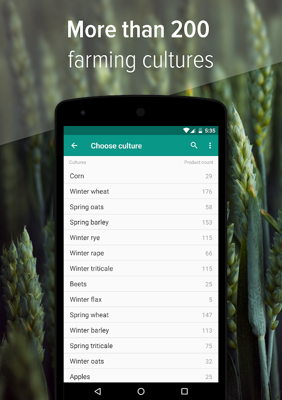 Мы поддерживаем пшеницу, кукурузу, сою, рожь, ячмень, сахарную свеклу, рапс и другие сельскохозяйственные сорта. Пестициды относятся к группам гербицидов, фунгицидов, инсектицидов, адъювантов. Все пестициды можно фильтровать с помощью ползунка стадии выращивания BBCH. Мы постоянно обновляем нашу базу пестицидов с помощью основных всемирно известных производителей пестицидов, таких как Syngenta, Bayer, Basf, Adama и другие.
