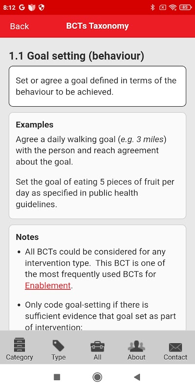 Это приложение является простой в навигации и полностью доступной для поиска версией таксономии изменения поведения v1 (BCTTv1), опубликованной Michie et al. (2013).