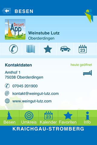 Die Besen-App des Kraichgau-Stromberg Tourismus e.V. bietet zahlreiche Informationen über lokale Besenwirtschaften, deren Adressdaten und Öffnungszeiten. Der integrierte Besenkalender informiert tagesaktuell über geöffneten Besenwirtschaften und etwaige Highlights. Die Umkreissuche sowie eine Favoriten- und Kalenderfunktion gehören ebenfalls zum Leistungsangebot der Kraichgau-Stromberg Besen App.