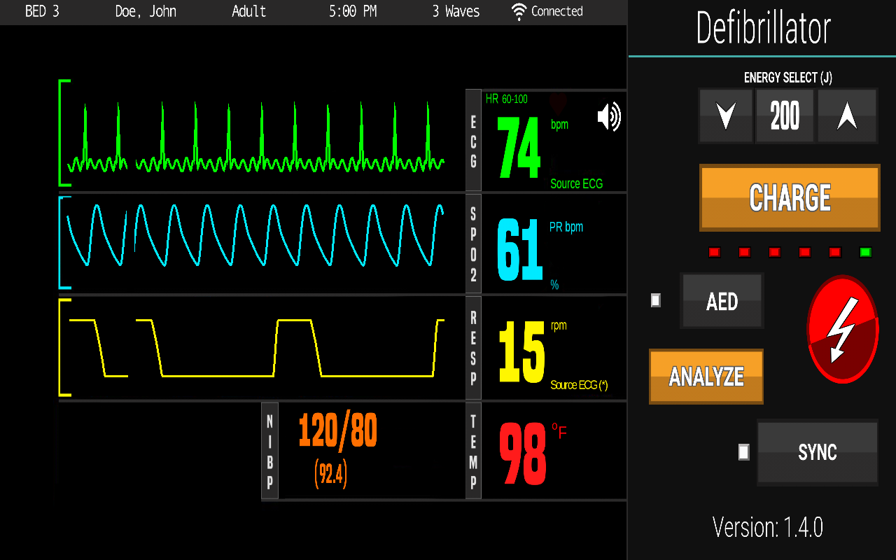 PerSim ™ Monitor - это реалистичный дефибриллятор монитора жизненно важных функций для PerSim ™. Особенности включают различные формы сердечной волны, в том числе афиб, vfib, асистолию, трепетание предсердий, Mobitz 1 и 2 и многие другие. Монитор PerSim ™ также имеет общие функции дефибрилляции, такие как AED, ручная дефибрилляция и синхронизация.