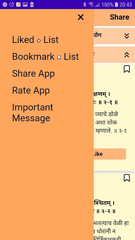 Все «Adhays» и «Shlokas» доступны на санскрите с легким для понимания маратхи. Пользователь может сделать закладку «Шлока» для быстрого доступа. Пользователи также могут составить список избранного Шлоки. Пользователь может легко делиться "Шлока" с друзьями и семьей, используя приложения для обмена сообщениями или почтовые сервисы. Мы планируем использовать еще больше возможностей этого приложения, чтобы сделать его более точным, простым в использовании и более интерактивным.