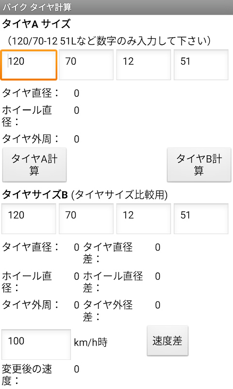 ご使用のバイクのタイヤサイズを入力してからタイヤ計算をタップするだけで