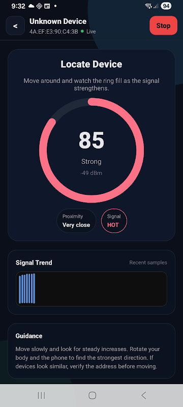 Приложение BLE Finder помогает находить ваши собственные устройства Bluetooth Low Energy (BLE), сканируя рекламные объявления поблизости и визуализируя уровень сигнала (RSSI). Это приложение только сканирует — оно не выполняет сопряжение или подключение.