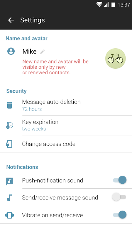 Применение упаковывает все особенности современного приложения для обмена сообщениями с добавлением слоя мер безопасности, таких как локальное шифрование базы данных, пин-код, приложение блокировки и сообщений автоматического удаления.