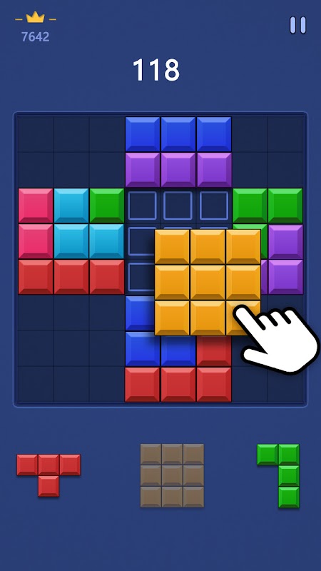 Игра проста и увлекательна: перетащите кусочки головоломки на доску, чтобы заполнить ряд или столбец и завершить устранение.