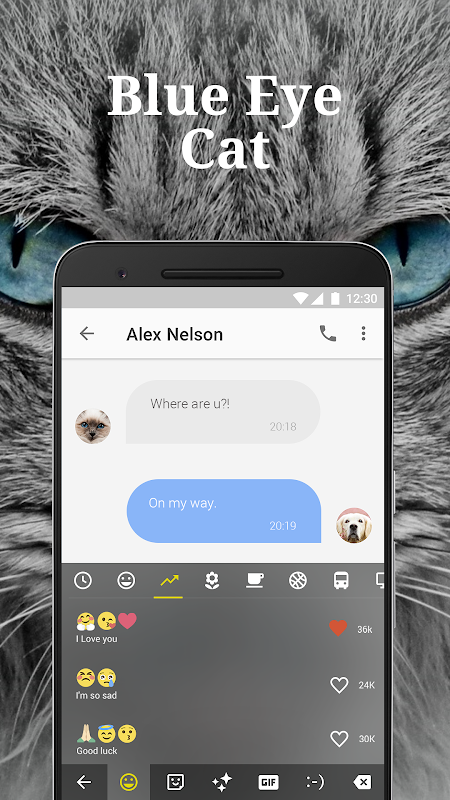 This Blue Eyes Cat Keyboard Theme uses Facemoji Keyboard Facemoji Keyboard + GIFS. Please click the link to have it installed first.