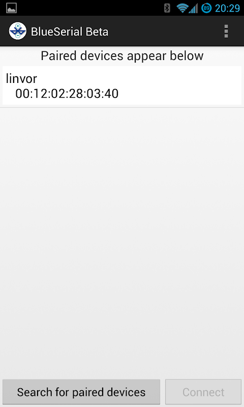 Синий Серийный это приложение с открытым исходным кодом для подключения Android устройства к устройству с поддержкой Bluetooth система последовательного, такие как Arduino и других устройств. Он был протестирован для работы с модулем JY-MCU и должен работать для широкого спектра устройств.