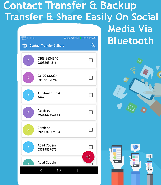 Transfer contacts Via Bluetooth or Social Media :