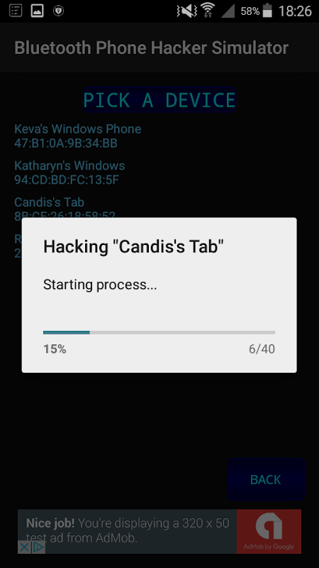 You can then select one of the devices from the list, a hacking progress bar will appear and you can show your friends that you are hacking into the phone!