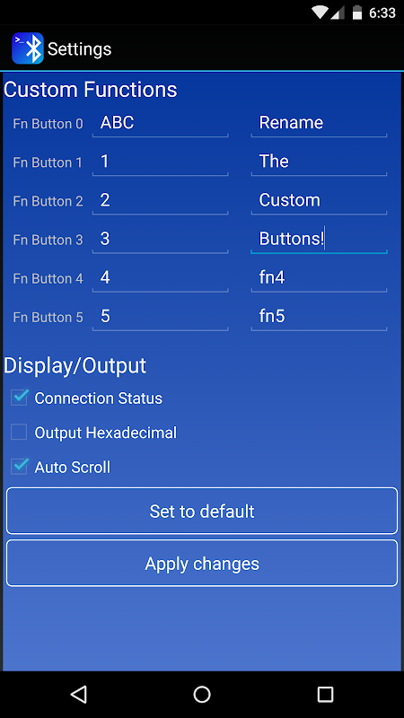 Customisable function buttons, autoscroll on/off, terminal can display ASCII and Hex.