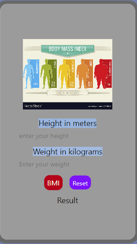 Вы вводите рост и вес, а затем он сообщает вам ваш ИМТ, затем он сообщает вам о состоянии вашего здоровья и показывает, нужно ли вам сбросить или набрать вес, а затем вы сможете найти советы, как сбросить или набрать вес.