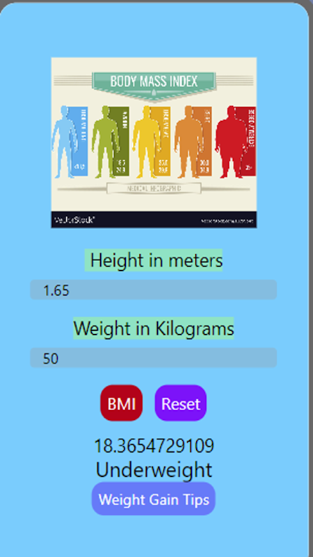 Это приложение рассчитывает массу вашего тела/ИМТ. С помощью этого приложения вы можете ввести свой рост и вес, а затем проверить здоровье человека.