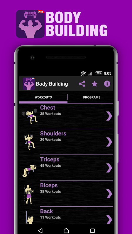 Bodybuilding Programs allows you to customize your daily workout plan using different exercises suggested for each part of your body.