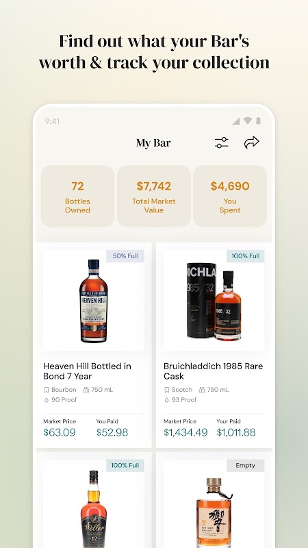 Просматривайте рыночные цены на спиртные напитки, отслеживайте свой бар и находите бутылки в списке желаний.