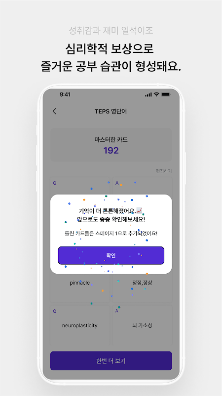 - «Интуитивное чувство выполненного долга»: по мере того, как ваша способность запоминать улучшается в реальном времени и вы даже получаете похвалу, вы будете чувствовать себя хорошо, и учеба станет привычкой. Посмотрите сами, как заполняется ваша память с помощью BrainyCard!