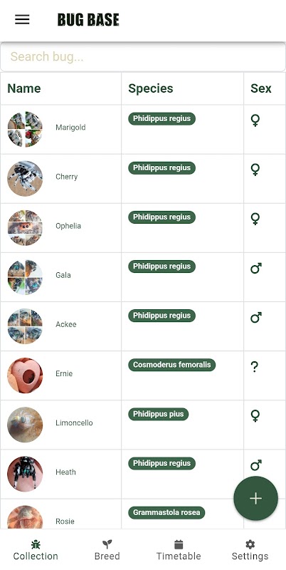 - Создайте обширную коллекцию, добавив беспозвоночных с их именем, полом, видом, общим названием, оригинальной информацией о заводчике и многим другим.