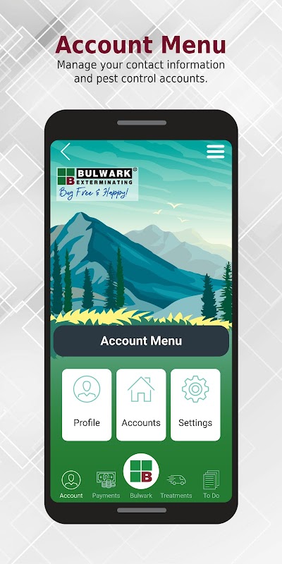 • Главное меню — запросите обслуживание, оплатите счет и управляйте своими учетными записями Bulwark для борьбы с вредителями.