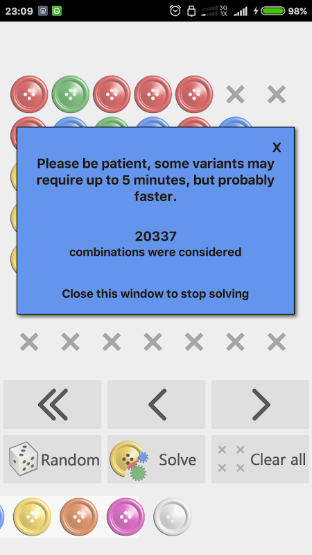 Программа решает любую комбинацию пуговиц, по правилам популярной игры, всего одним нажатием. Задавайте любые позиции и количество пуговиц вплоть до 7x7 Исследуйте возможность решения любой позиции в игре. Проверяйте придуманные вами позиции на возможность решения.