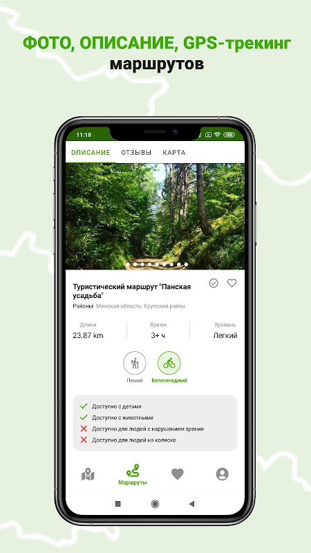 Маршруты по Беларуси на любой вкус: разные виды, сложность и тематика. Каждый маршрут имеет систему обозначений доступности: для людей на коляске и с нарушением зрения, для детей, а также для путешествия с животными.
