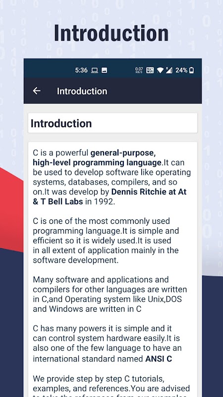 Если вы находите бесшовное приложение для обучения программированию на C, это приложение для обучения C содержит все основы языка C для начинающих. Вы сможете справиться или преодолеть любые типы последствий языка C. Если вы приходите на собеседование по программированию на языке C, то приложение для обучения C вам просто необходимо. Когда вы запускаете это приложение на языке C, программирование не требует предварительных знаний о программировании, и это приложение для обучения C идеально подходит для новичков, которые хотят научиться программировать и сделать свою карьеру в области разработки ИТ. Язык программирования C - это очень мощный язык программирования, который позволяет разрабатывать самые разные приложения.