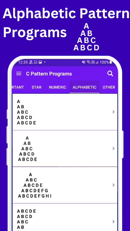 "C Pattern Programs" – это исключительное приложение, предназначенное для начинающих программистов и предлагающее множество шаблонов и других программ на языке C. Приложение выходит за рамки обычного обучения, предоставляя обширные учебные материалы, связанные с программированием на C. Он служит ценным ресурсом для тех, кто стремится освоить концепции программирования на языке C, особенно когда речь идет о создании шаблонов и графических элементов ASCII.