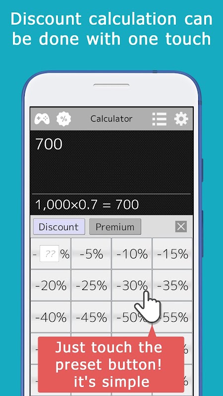 Расчеты скидок, например, скидки 30%, можно выполнить одним касанием.