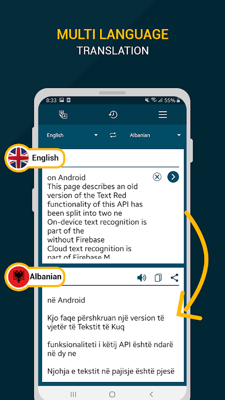 Возьмите изображение из любого документа и переведите его на другой язык мира. Приложение для перевода изображения в текст великолепно и помогает полному инструменту переводчика. Это может помочь вам в изучении любого языка, а также в общении с языками других стран. Он автоматически определяет язык с помощью камеры или голоса. Это приложение для голосового переводчика бесплатное, и оно поможет вам.