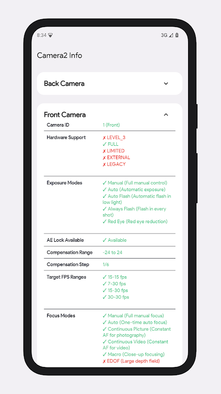 Camera2 Info — это легкая, но мощная утилита, которая поможет вам проверить поддержку API Camera2 и подробно проанализировать возможности камеры вашего устройства Android. Являетесь ли вы разработчиком мобильных устройств, энтузиастом фотоаппаратов или просто интересуетесь аппаратным обеспечением камеры вашего телефона, это приложение предоставит все, что вам нужно, в четком и организованном формате.