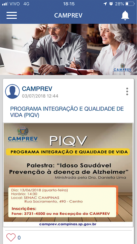 Заявление для пенсионеров и пенсионеров Института социального обеспечения муниципалитета Кампинас - CAMPREV. Позволяет провести консультации с заявлением об оплате и представлением документов о перерегистрации.