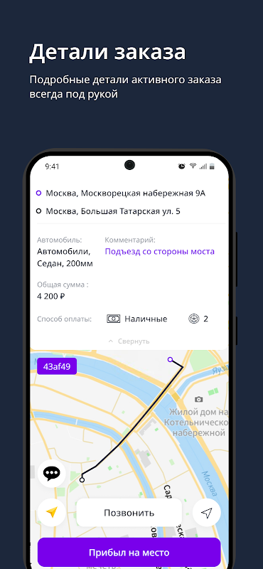 - Автоматический расчет времени, расстояния и стоимости заказа