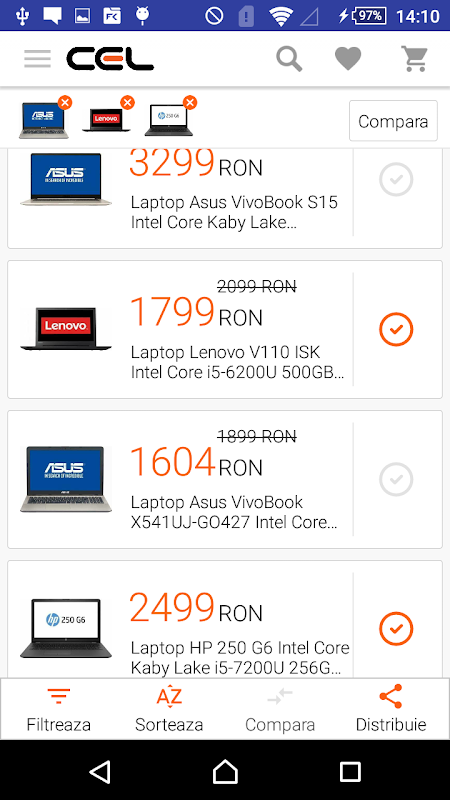 Cu aplicatia CEL.ro poti sa cumperi la preturi mici produsele pe care ti le doresti: telefoane, laptopuri, electrocasnice, televizoare, gadgeturi, jucarii, produse de ingrijire personala, parfumuri, ceasuri si RCA.