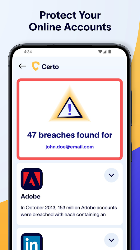 Миллиарды учетных данных раскрываются в результате утечек данных каждый год. Используйте Certo, чтобы узнать, скомпрометированы ли ваши учетные записи, и защитить себя от кражи личных данных и мошенничества.*