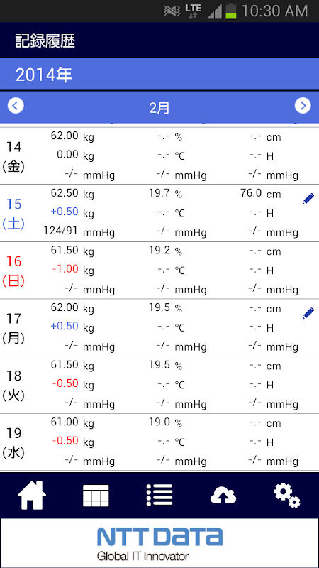日々入力した血圧、体温、睡眠時間などの記録を一覧で確認できます。