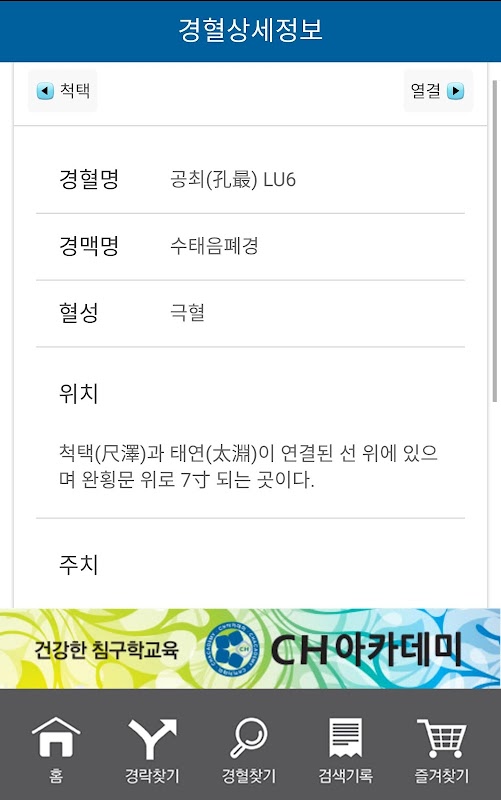1. 경락별로 경혈을 찾을 수 있습니다.