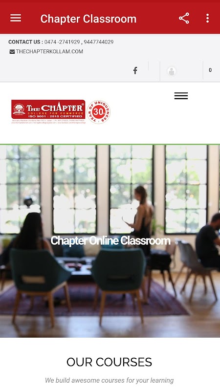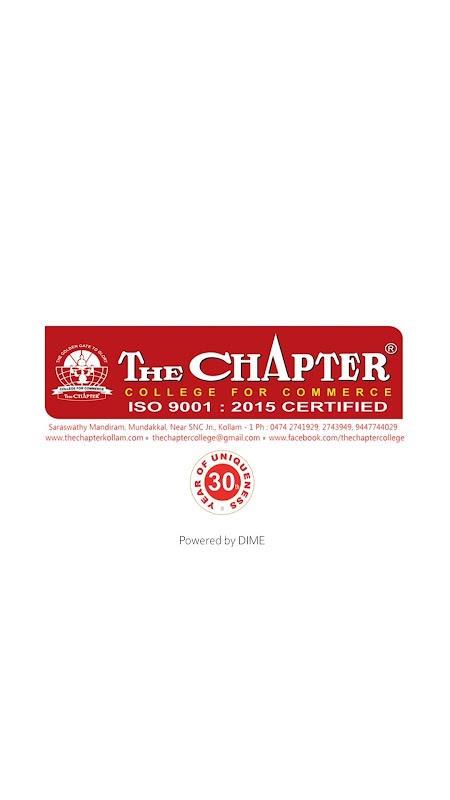 The Chapter - это частное учебное заведение, предназначенное исключительно для студентов-коммерсантов, созданное в 1991 году. С тех пор оно добилось похвальных и похвальных успехов в учебе. Пройдя 28 лет в своей академической деятельности, The Chapter получила столько первых и первых классов по результатам B.Com и M.Com, опубликованным Университетом Кералы и Университетом М.G. Каждый год наши студенты получают большое количество первых классов по результатам B.Com и M.Com в Университете Кералы. В плюс два результата (Open School Stream, Govt. Of Kerala) мы держим себя в числе самых значительных результатов в округе Коллам.
