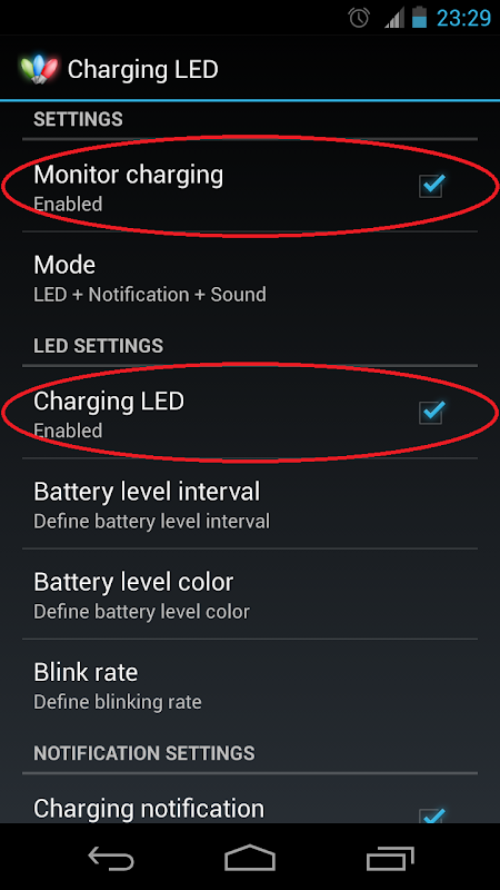 2 - Goto "Settings > Notifications > Charging LED" and change the notification level from Auto (tap on the 'A') to Level 4 (one level higher to the right).