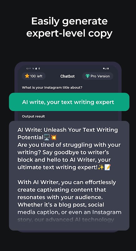 Добро пожаловать, чтобы улучшить свои навыки письма с помощью нашего интеллектуального помощника по письму. Это приложение создано для удобства писателей. Благодаря поддержке искусственного интеллекта наше приложение предоставляет персонализированные советы и повествования, которые помогут вам писать лучше, быстрее и эффективнее. Это приложение может помочь вам во всем, от вдохновения до творчества, а также даст рекомендации по улучшению вашего письма! Независимо от того, являетесь ли вы студентом, профессионалом или человеком, который хочет улучшить свои навыки письма, Chat AI Write окажет вам помощь. Благодаря мощной технологии искусственного интеллекта это приложение может помочь вам выполнить все задачи: от корректуры, проверки грамматики до улучшения письменных рекомендаций. Откройте приложение, введите или вставьте тему, которую нужно написать, а затем напишите в чате AI, чтобы завершить оставшуюся работу. Через несколько секунд у вас будет красивая и безошибочная копия, которой можно будет поделиться со всем миром. Благодаря нашей бесплатной пробной версии вы можете воспользоваться трехдневным бесплатным периодом и неограниченным доступом ко всем функциям, включая написание персонализированного статуса и многое другое. Так зачем ждать? Загрузите Chat AI Write сегодня и начните писать как профессионал!