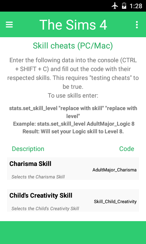 Чит коды к Sims включает в себя все новейшие читы для The Sims. Все читы легко доступны на телефоне, в любое время, так как приложение не требует интернет для работы. Читы были удобно сортируются по категориям, так что любой обман можно легко найти.