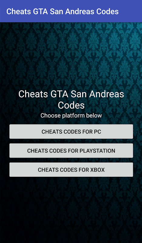 Cheats GTA San Andreas Codes In this application you will find all cheats and codes for GTA San Andreas on the PlayStation , Xbox and PC.