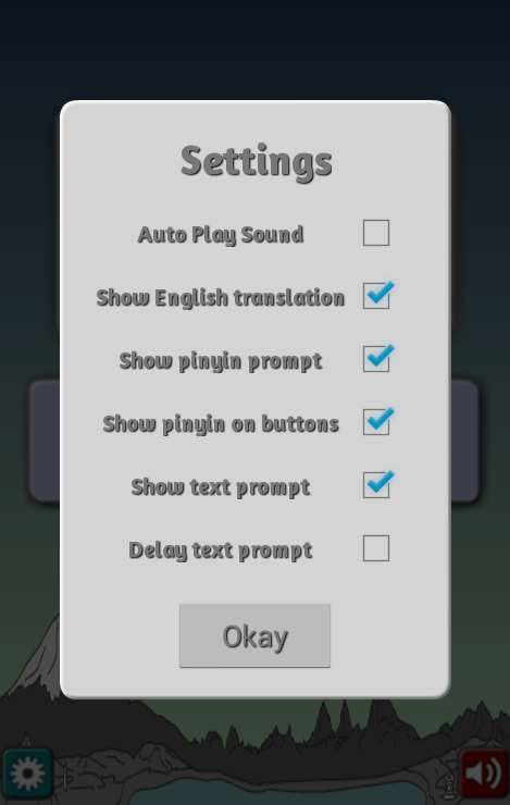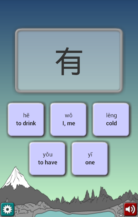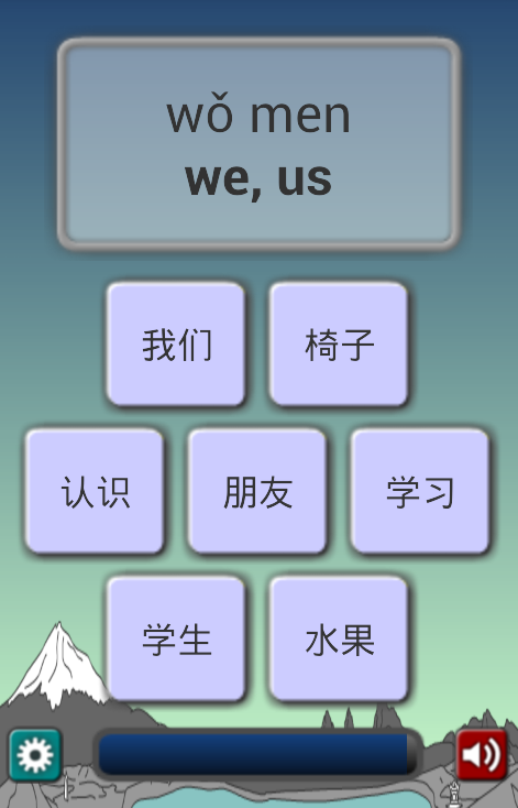 В этом режиме вы показать один символ и должны выбрать правильный пиньинь и английский перевод из набора восьми возможностей. У вас есть ограниченное количество времени, чтобы все символы.