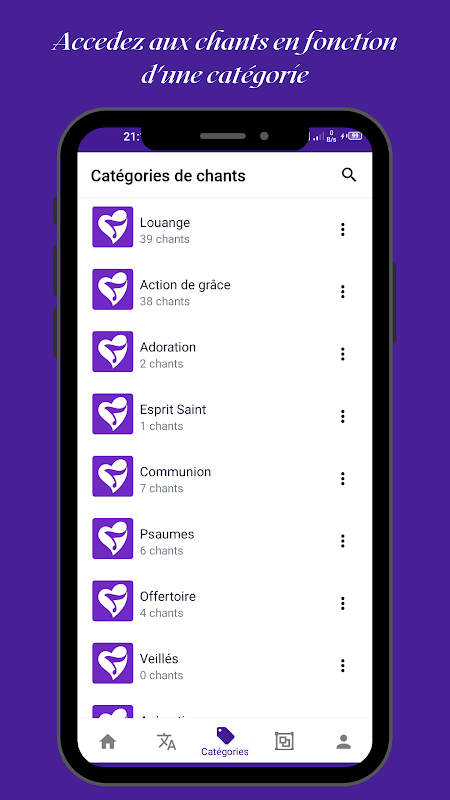 Les chant sont regroupés en catégories (plus de 100 catégories de chants) et en langues (plus de 50 langues).